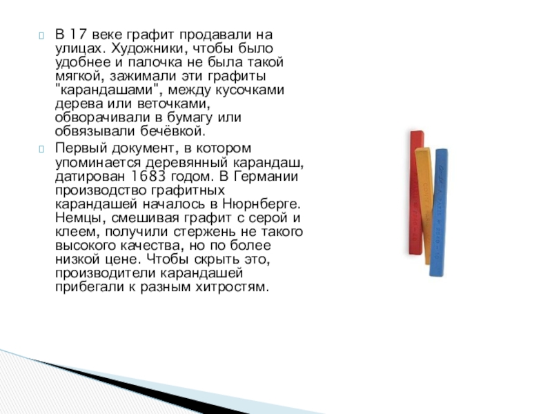 Слайд 5В 17 веке графит продавали на улицах. Художники, чтобы было удобнее
