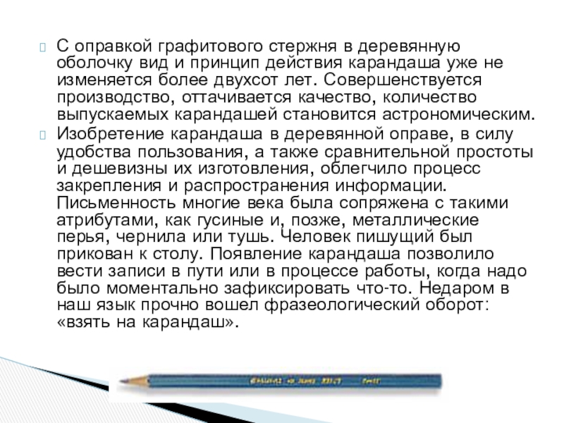 Изобретение карандаша в деревянной оправе, в силу удобства пользования, а также сравнительной простоты и дешевизны их изготовления, облегчило процесс закрепления и распространения информации. Письменность многие века была сопряжена с такими атрибутами, как гусиные и, позже, металлические перья, чернила или тушь. Человек пишущий был прикован к столу. Появление карандаша позволило вести записи в пути или в процессе работы, когда надо было моментально зафиксировать что-то. Недаром в наш язык прочно вошел фразеологический оборот: «взять на карандаш».