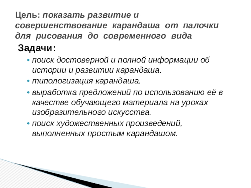 Цель: показать развитие и совершенствование карандаша от палочки для рисования до современного вида
