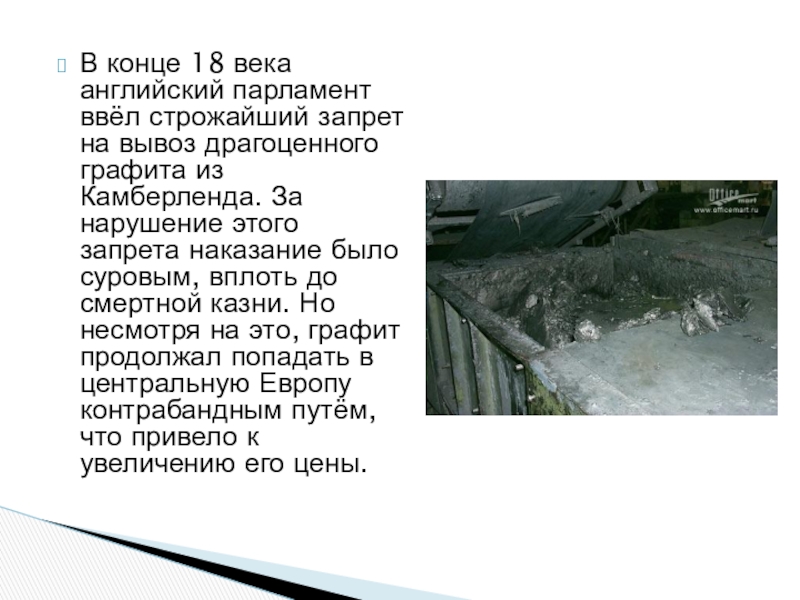 драгоценного графита из Камберленда. За нарушение этого запрета наказание было суровым, вплоть до смертной казни. Но несмотря на это, графит продолжал попадать в центральную Европу контрабандным путём, что привело к увеличению его цены.