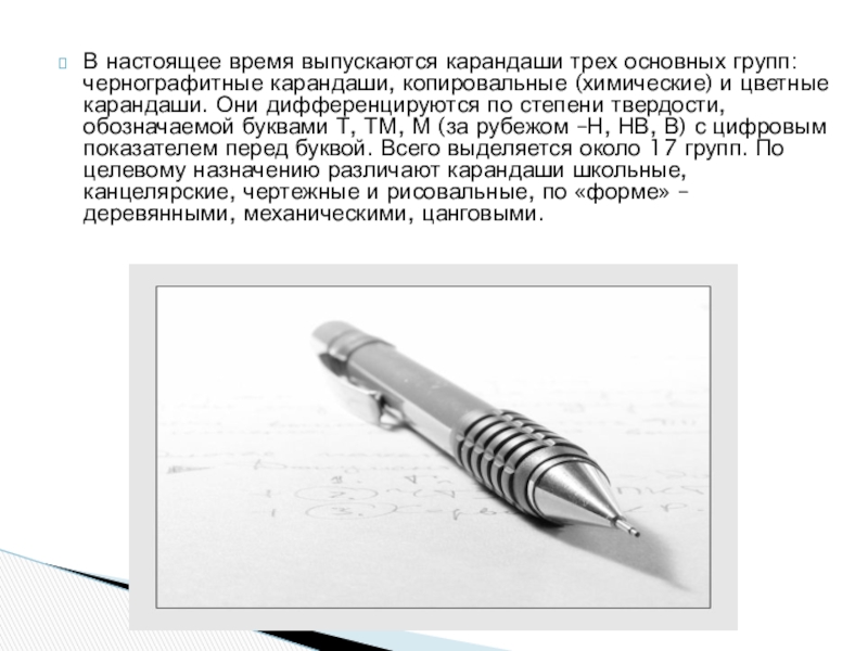 Слайд 13В настоящее время выпускаются карандаши трех основных групп: чернографитные карандаши, копировальные