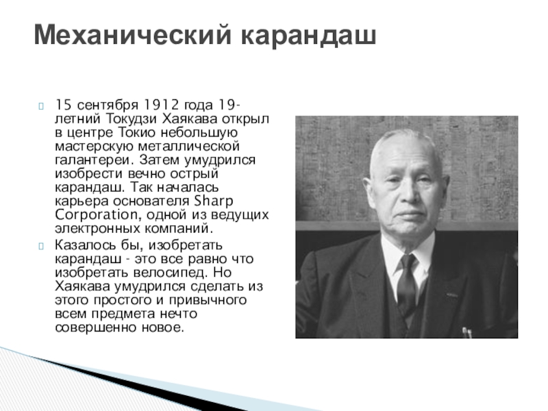 небольшую мастерскую металлической галантереи. Затем умудрился изобрести вечно острый карандаш. Так началась карьера основателя Sharp Corporation, одной из ведущих электронных компаний.