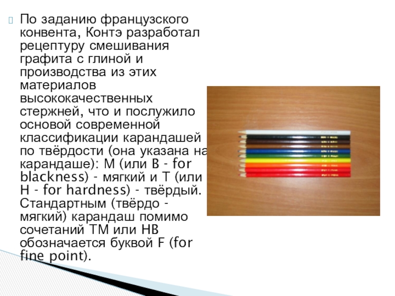 и производства из этих материалов высококачественных стержней, что и послужило основой современной классификации карандашей по твёрдости (она указана на карандаше): М (или B - for blackness) - мягкий и Т (или H - for hardness) - твёрдый. Стандартным (твёрдо - мягкий) карандаш помимо сочетаний ТМ или HB обозначается буквой F (for fine point).
