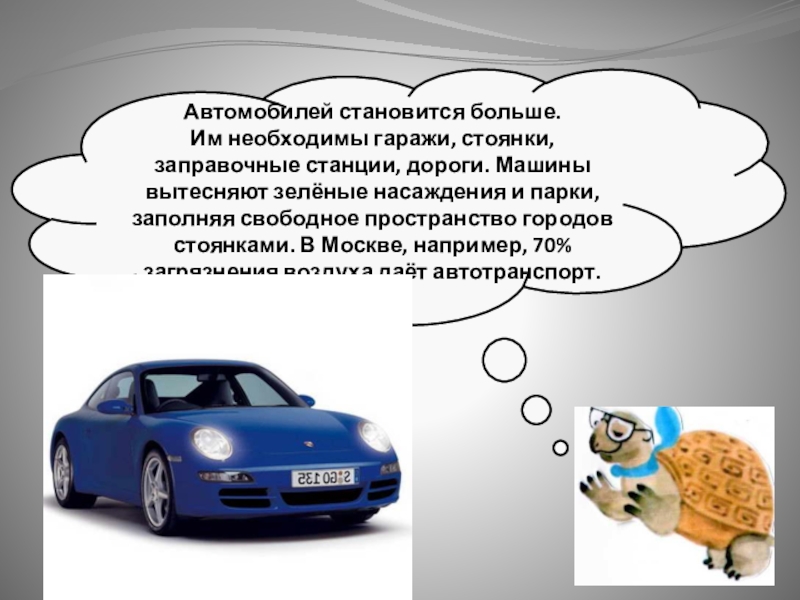 вытесняют зелёные насаждения и парки, заполняя свободное пространство городов стоянками. В Москве, например, 70% загрязнения воздуха даёт автотранспорт.