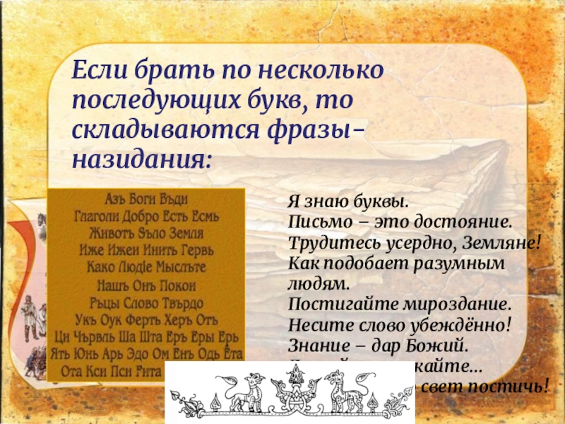 Если брать по несколько последующих букв, то складываются фразы-назидания: