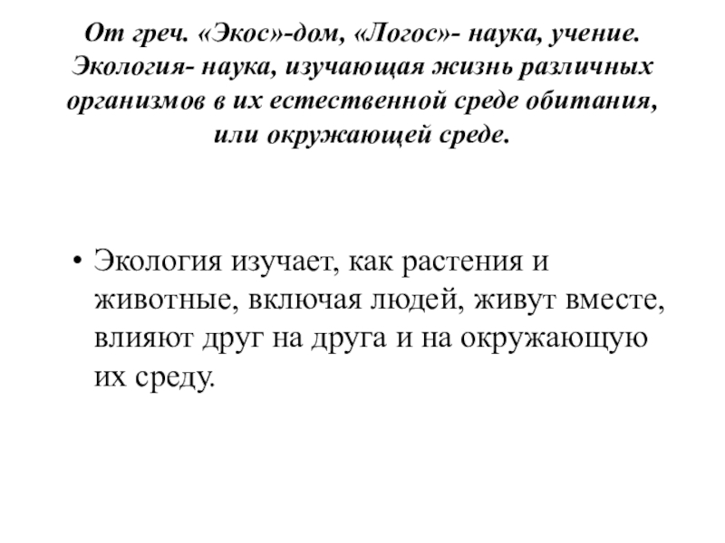 Экология изучает, как растения и животные, включая людей, живут вместе, влияют друг на друга и на окружающую их среду.