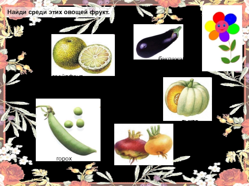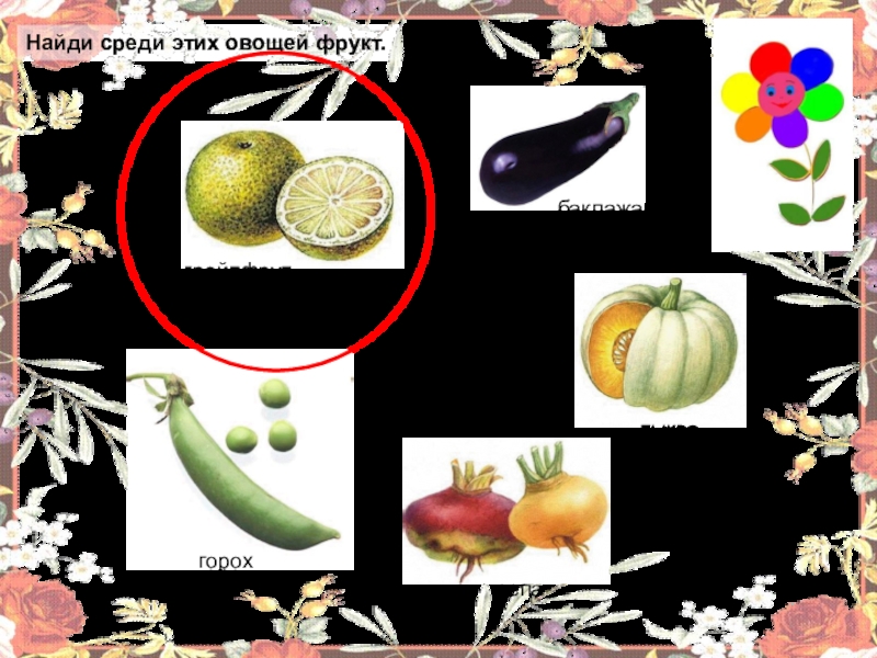 Найди среди этих овощей фрукт.грейпфрутбаклажантыквагорохрепа