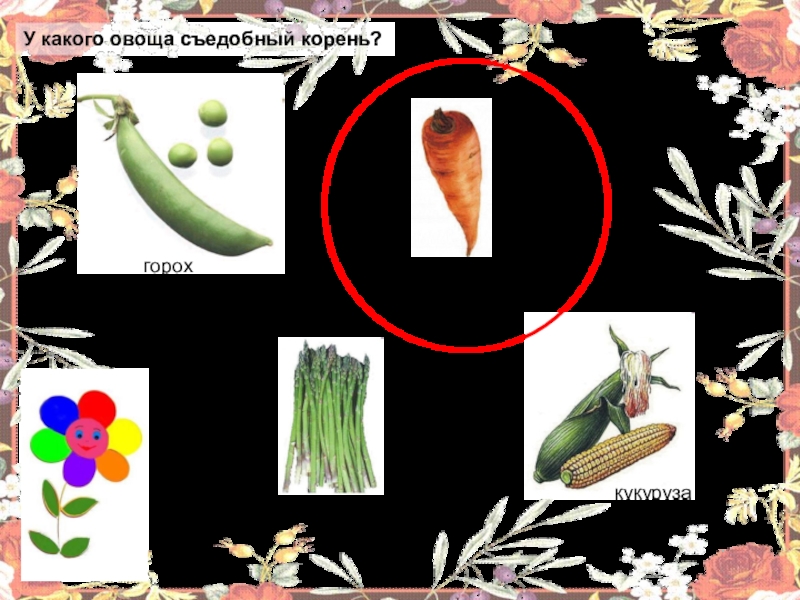 У какого овоща съедобный корень?горохспаржаморковькукуруза