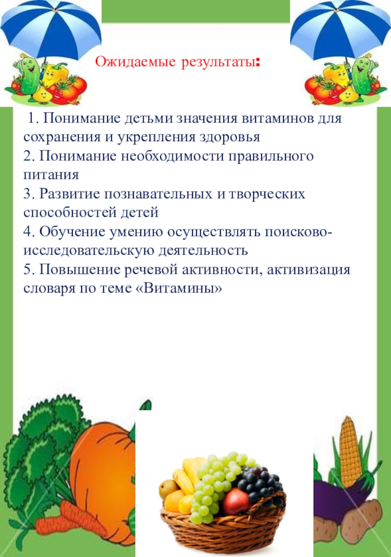1. Обогатить и расширить представления детей об овощах и фруктах, их пользе для здоровья.