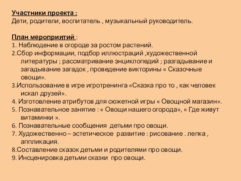 Участники проекта :Дети, родители, воспитатель , музыкальный руководитель.План мероприятий :1. Наблюдение в огороде за ростом растений.2.Сбор информации,