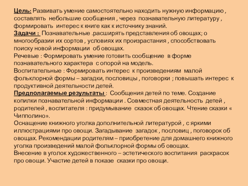 Цель: Развивать умение самостоятельно находить нужную информацию , составлять небольшие сообщения , через познавательную литературу , формировать интерес к книге как к источнику знаний.Задачи : Познавательные .расширять представления об овощах; о многообразии их сортов , условиях