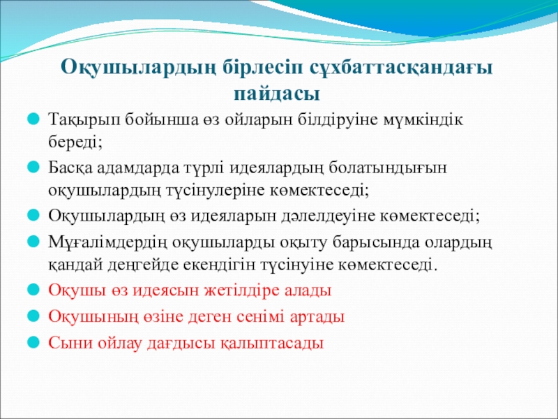 Слайд 4Оқушылардың бірлесіп сұхбаттасқандағы пайдасы
