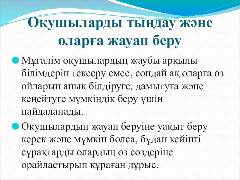 Слайд 17Оқушыларды тыңдау және оларға жауап беру
