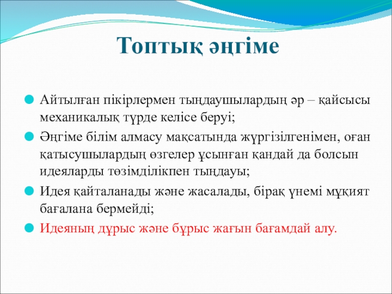 білім алмасу мақсатында жүргізілгенімен, оған қатысушылардың өзгелер ұсынған қандай да болсын идеяларды төзімділікпен тыңдауы;
