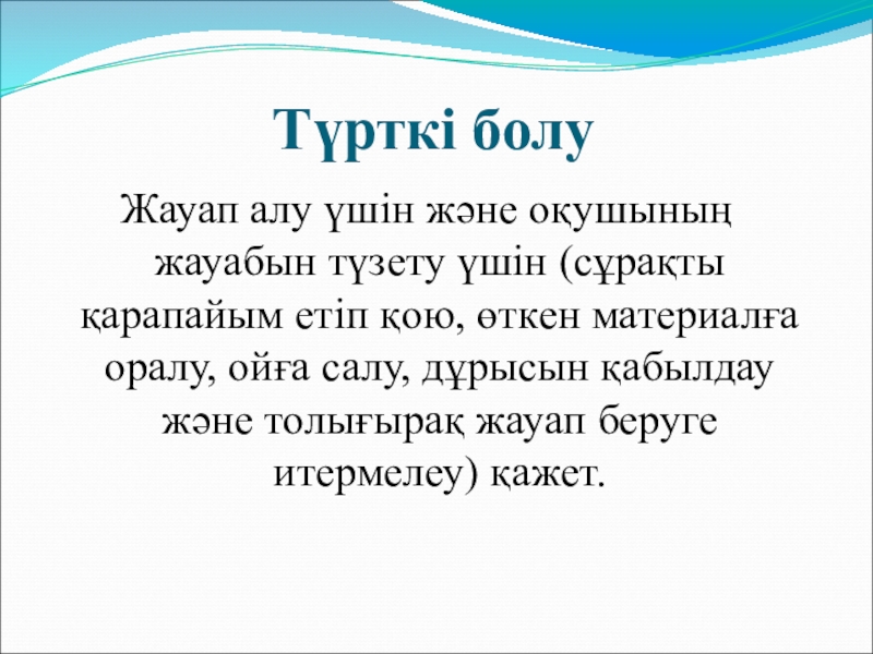 етіп қою, өткен материалға оралу, ойға салу, дұрысын қабылдау және толығырақ жауап беруге итермелеу) қажет.