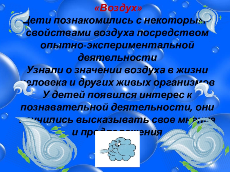 Узнали о значении воздуха в жизни человека и других живых организмов У детей появился интерес к познавательной деятельности, они научились высказывать свое мнение и предположения