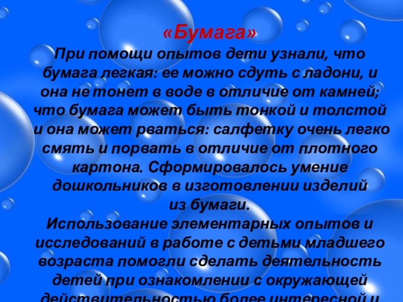 с ладони, и она не тонет в воде в отличие от камней; что бумага может быть тонкой и толстой и она может рваться: салфетку очень легко смять и порвать в отличие от плотного картона. Сформировалось умение дошкольников в изготовлении изделий из бумаги.