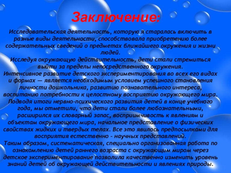 Таким образом, систематическая, специально организованная работа по ознакомлению детей раннего возраста с окружающим миром через детское экспериментирование позволила качественно изменить уровень знаний детей об окружающей действительности и явлениях природы.