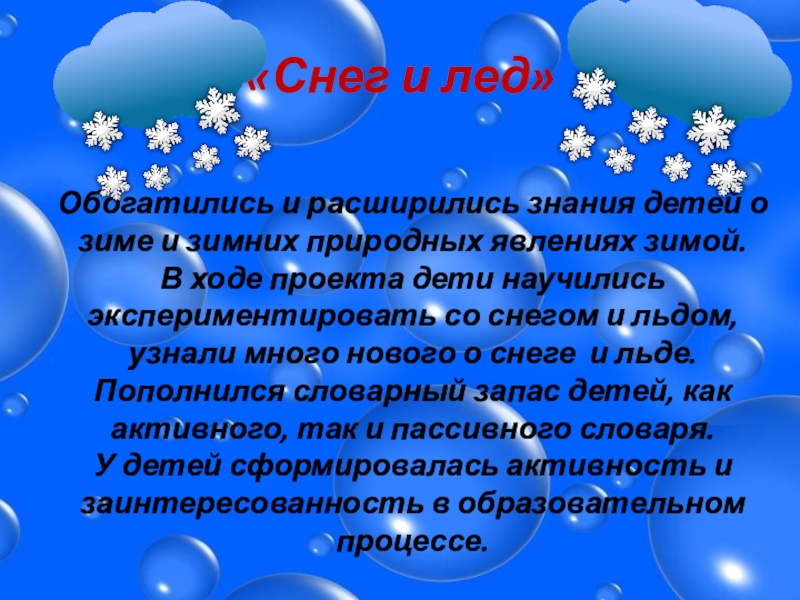 В ходе проекта дети научились экспериментировать со снегом и льдом, узнали много нового о снеге и льде.