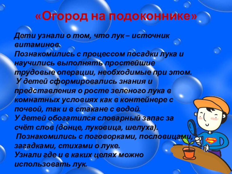 с процессом посадки лука и научились выполнять простейшие трудовые операции, необходимые при этом.