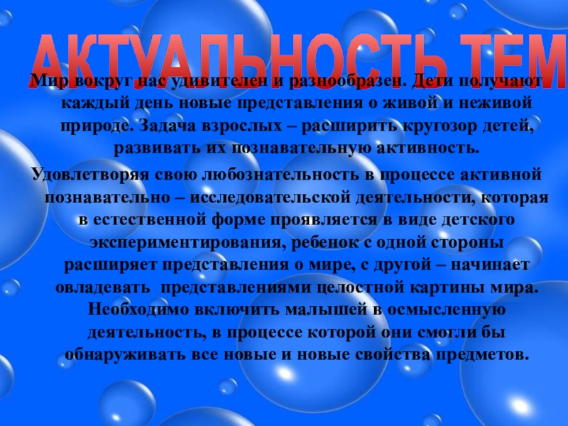 Удовлетворяя свою любознательность в процессе активной познавательно – исследовательской деятельности, которая в естественной форме проявляется в виде детского экспериментирования, ребенок с одной стороны расширяет представления о мире, с другой – начинает овладевать представлениями целостной картины мира. Необходимо включить малышей в осмысленную деятельность, в процессе которой они смогли бы обнаруживать все новые и новые свойства предметов.