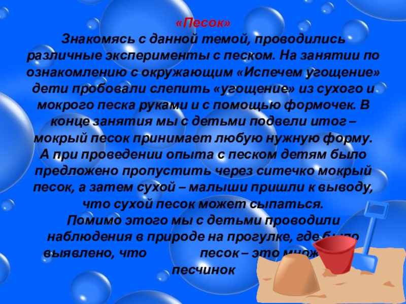 Знакомясь с данной темой, проводились различные эксперименты с песком. На занятии