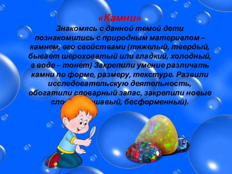 камнем, его свойствами (тяжелый, твердый, бывает шероховатый или гладкий, холодный, в воде – тонет) Закрепили умение различать камни по форме, размеру, текстуре. Развили исследовательскую деятельность, обогатили словарный запас, закрепили новые слова (шершавый, бесформенный).