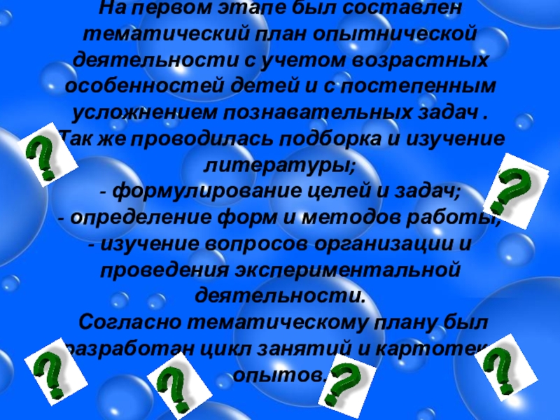 Слайд 4На первом этапе был составлен тематический план опытнической деятельности с учетом