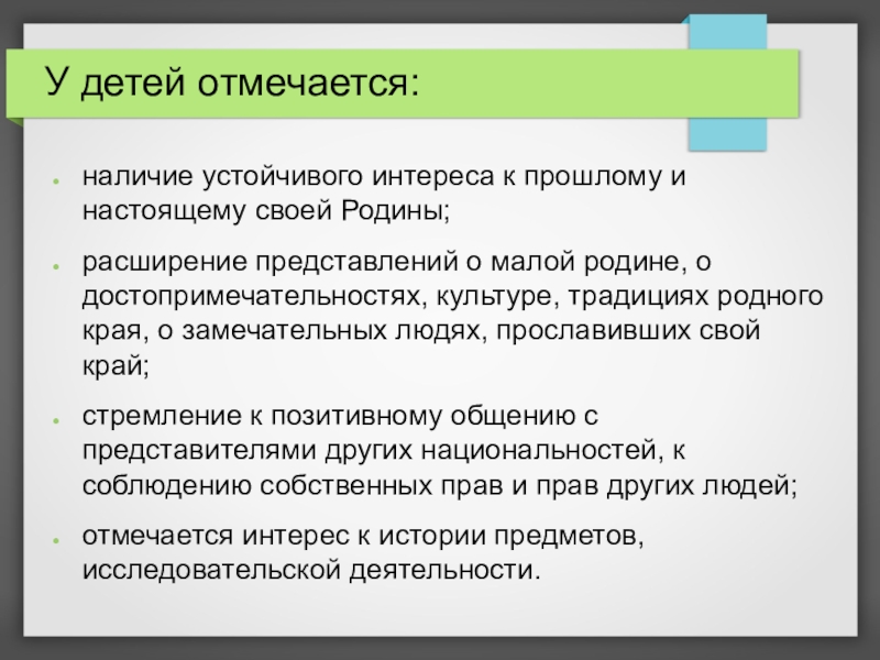 наличие устойчивого интереса к прошлому и настоящему своей Родины;