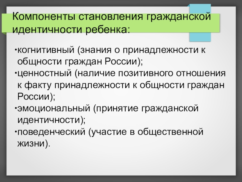 Слайд 2Компоненты становления гражданской идентичности ребенка: