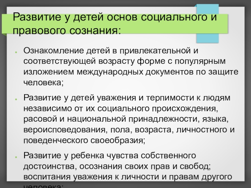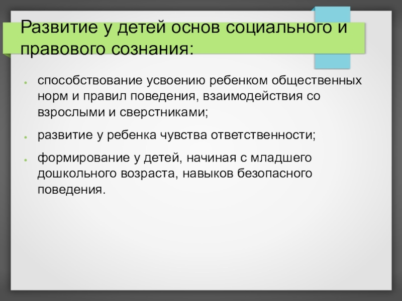 Слайд 5Развитие у детей основ социального и правового сознания: