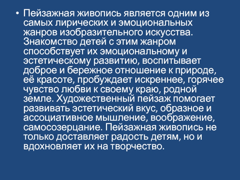 искусства. Знакомство детей с этим жанром способствует их эмоциональному и эстетическому развитию, воспитывает доброе и бережное отношение к природе, её красоте, пробуждает искреннее, горячее чувство любви к своему краю, родной земле. Художественный пейзаж помогает развивать эстетический вкус, образное и ассоциативное мышление, воображение, самосозерцание. Пейзажная живопись не только доставляет радость детям, но и вдохновляет их на творчество.