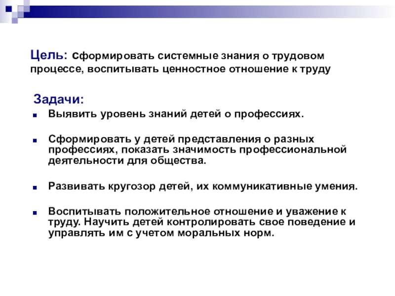 Сформировать у детей представления о разных профессиях, показать значимость профессиональной деятельности для общества.
