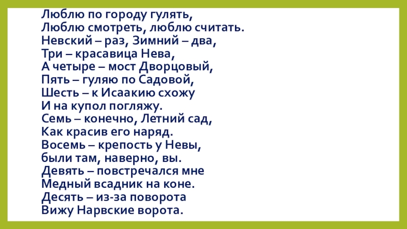 два, Три – красавица Нева, А четыре – мост Дворцовый, Пять – гуляю по Садовой, Шесть – к Исаакию схожу И на купол погляжу. Семь – конечно, Летний сад, Как красив его наряд. Восемь – крепость у Невы, были там, наверно, вы. Девять – повстречался мне Медный всадник на коне. Десять – из-за поворота Вижу Нарвские ворота.