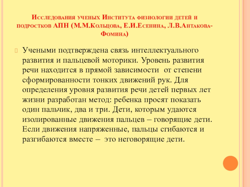Слайд 5Исследования ученых Института физиологии детей и подростков АПН (М.М.Кольцова, Е.И.Есенина, Л.В.Антакова-Фомина)