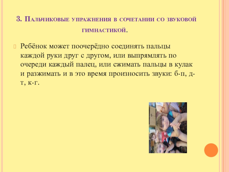 Слайд 143. Пальчиковые упражнения в сочетании со звуковой гимнастикой.