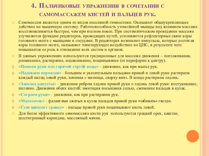 4. Пальчиковые упражнения в сочетании с самомассажем кистей и пальцев рук.