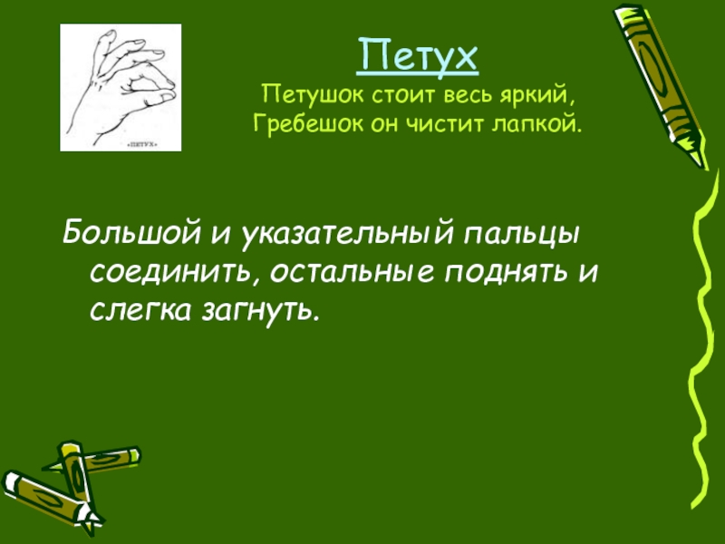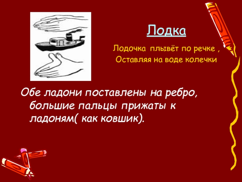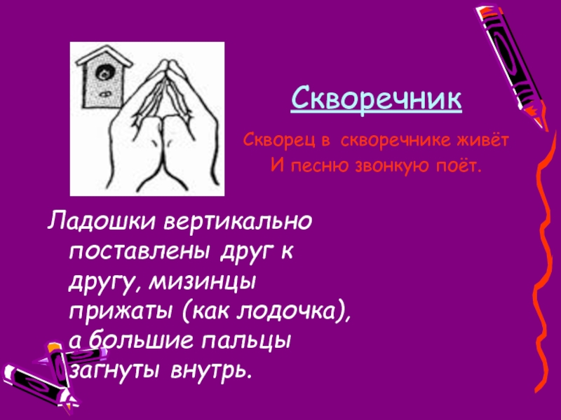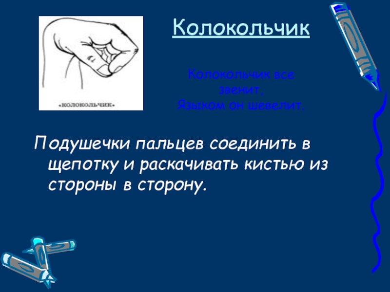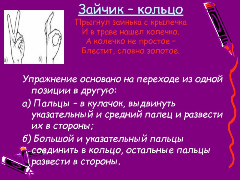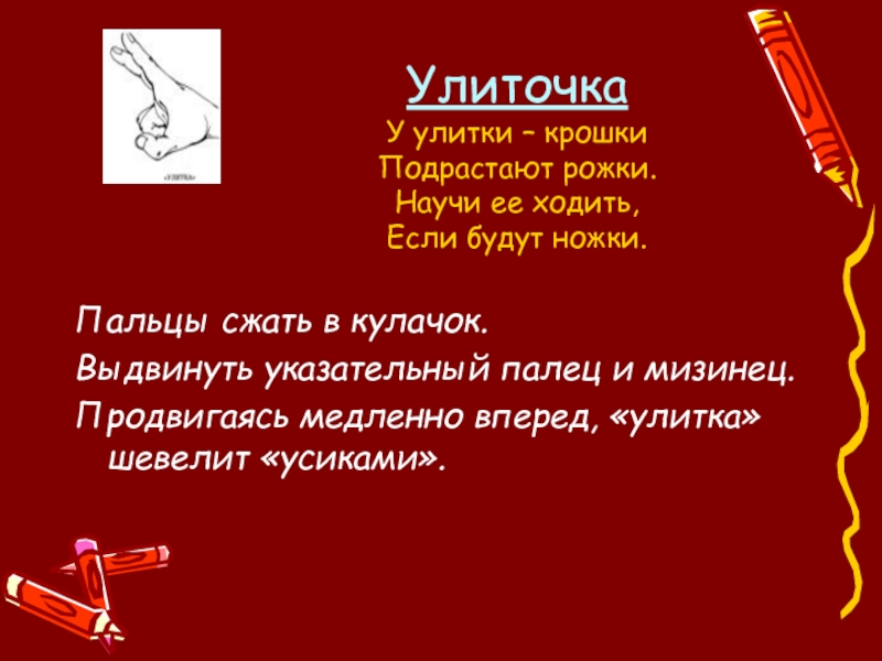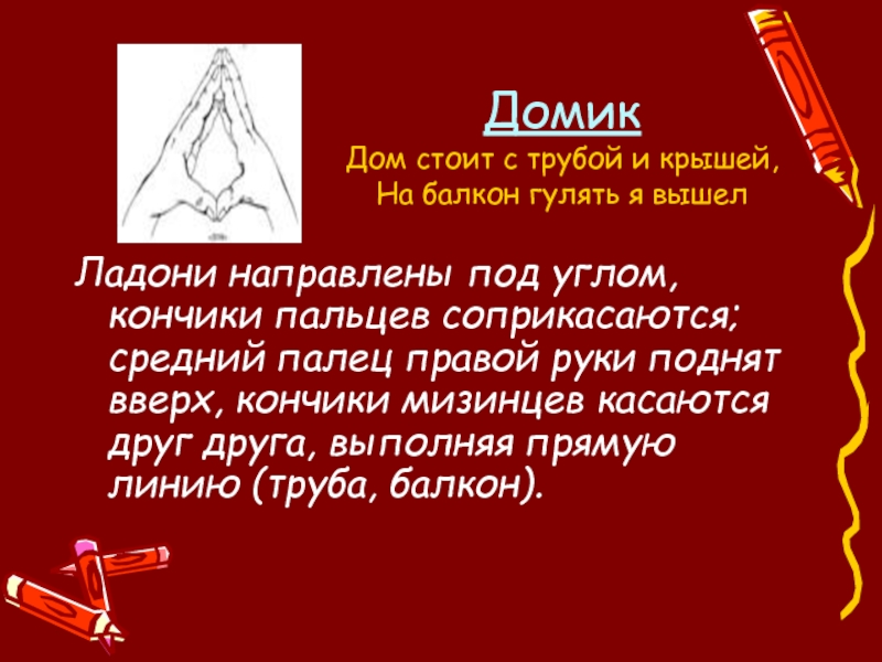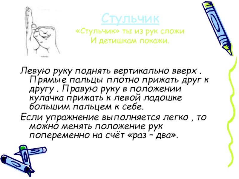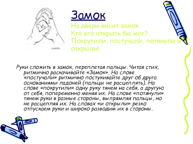 Руки сложить в замок, переплетая пальцы. Читая стих, ритмично раскачивайте «Замок». На слове «постучали» ритмично постукивайте друг об друга основаниями ладоней (пальцы не расцеплять). На слове «покрутили» одну руку тянем на себя, а другую от себя, попеременно меняя их. На слове «потянули» тянем руки в разные стороны, выпрямляя пальцы, но не расцепляя их. На словах «и открыли» резко отпускаем руки и широко разводим их в стороны.