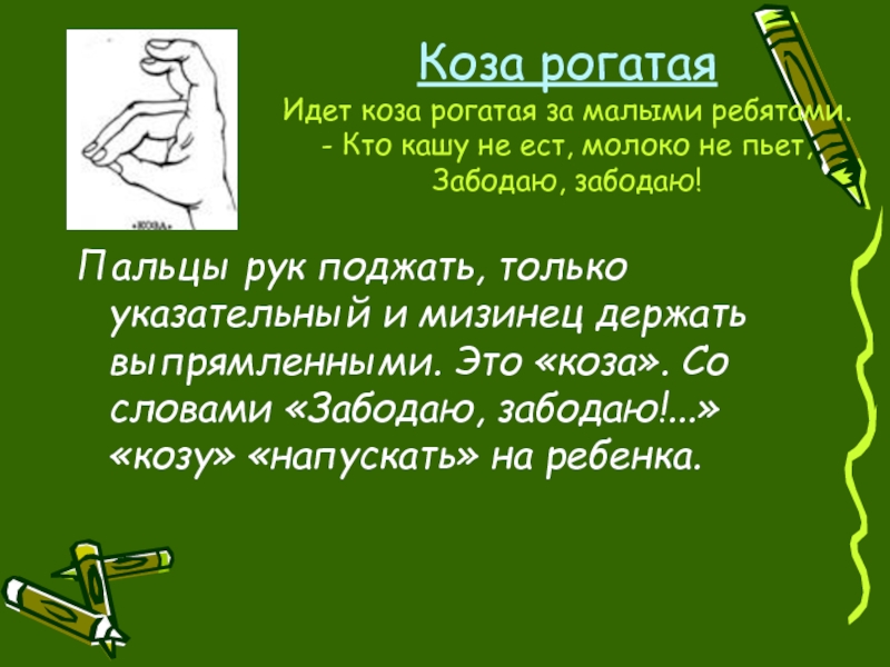 Пальцы рук поджать, только указательный и мизинец держать выпрямленными. Это «коза». Со словами «Забодаю, забодаю!...» «козу» «напускать» на ребенка.
