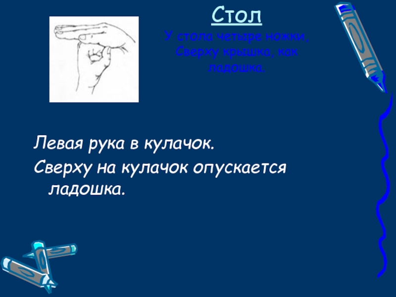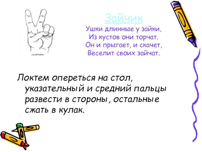 Локтем опереться на стол, указательный и средний пальцы развести в стороны, остальные сжать в кулак.