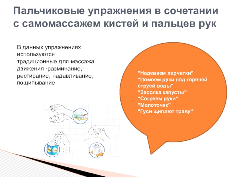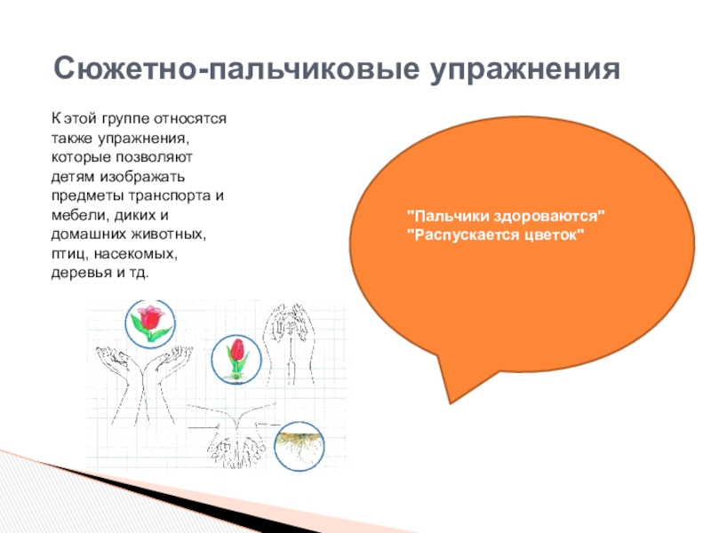 Пальчиковые упражнения разнообразны по содержанию, их разделили на группы :