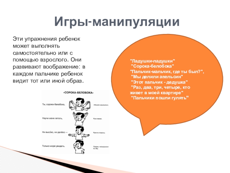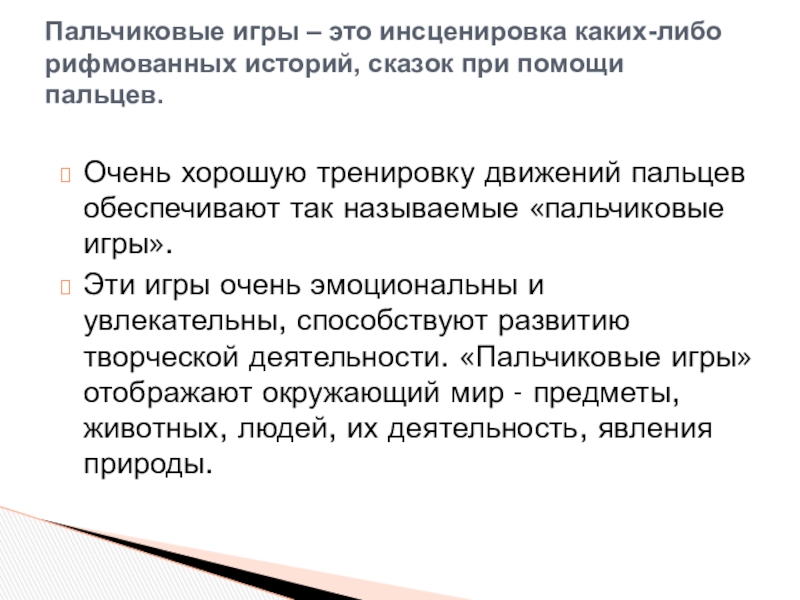 Пальчиковые игры – это инсценировка каких-либо рифмованных историй, сказок при помощи пальцев.