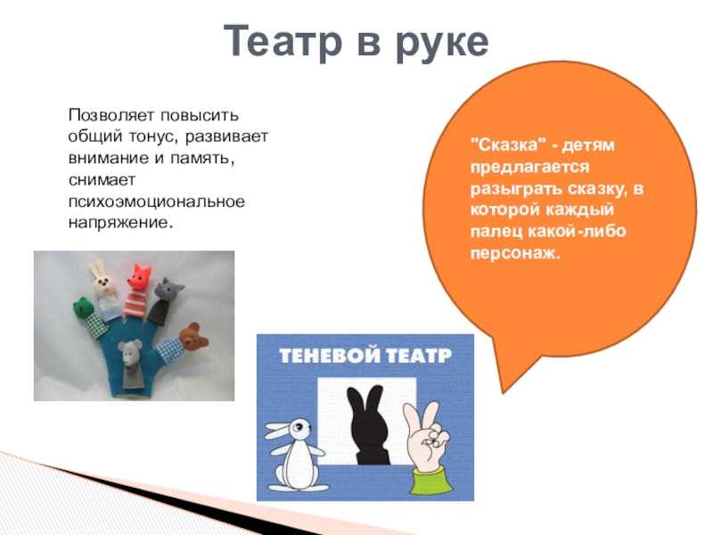"Сказка" - детям предлагается разыграть сказку, в которой каждый палец какой-либо персонаж.