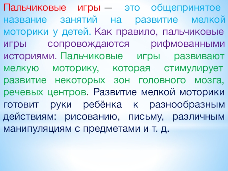 Слайд 2Пальчиковые игры — это общепринятое название занятий на развитие мелкой моторики у