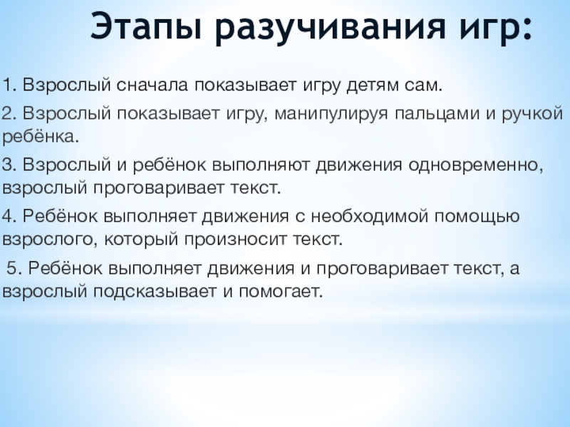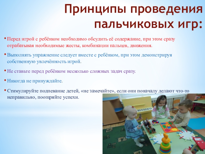 Слайд 8Принципы проведения пальчиковых игр: