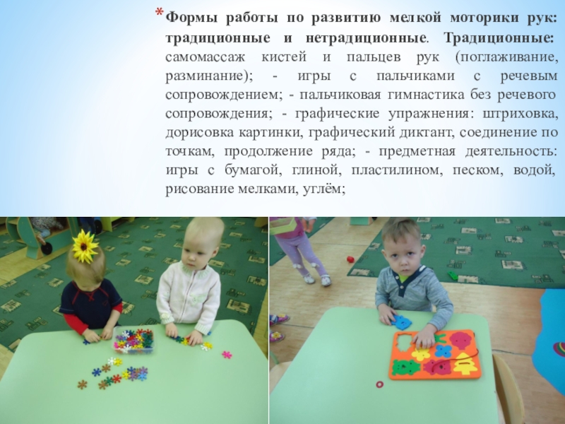 Слайд 3Формы работы по развитию мелкой моторики рук: традиционные и нетрадиционные. Традиционные: