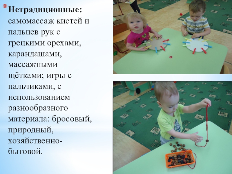 Слайд 5Нетрадиционные: самомассаж кистей и пальцев рук с грецкими орехами, карандашами, массажными