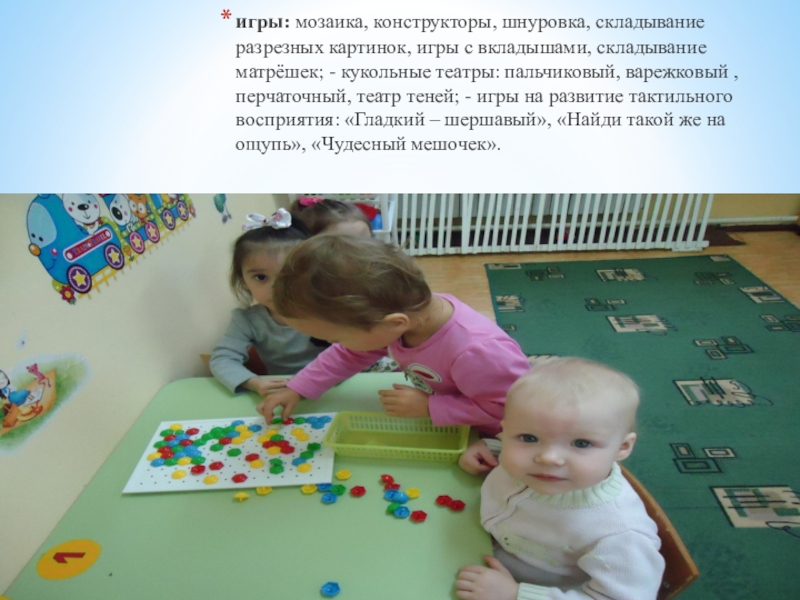 Слайд 4игры: мозаика, конструкторы, шнуровка, складывание разрезных картинок, игры с вкладышами, складывание