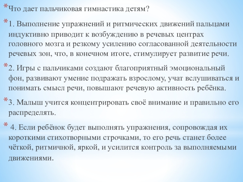 Слайд 7Что дает пальчиковая гимнастика детям?