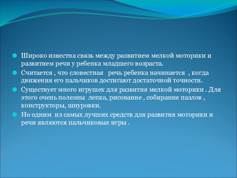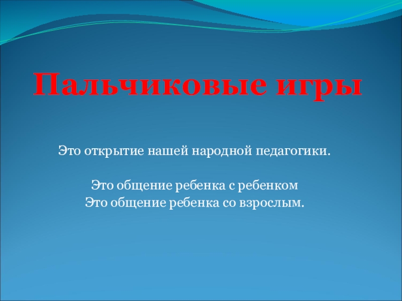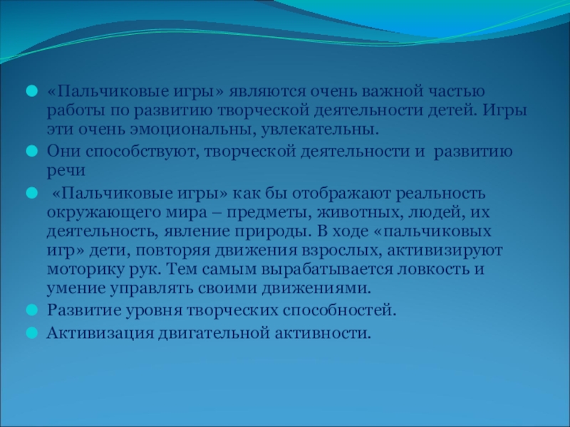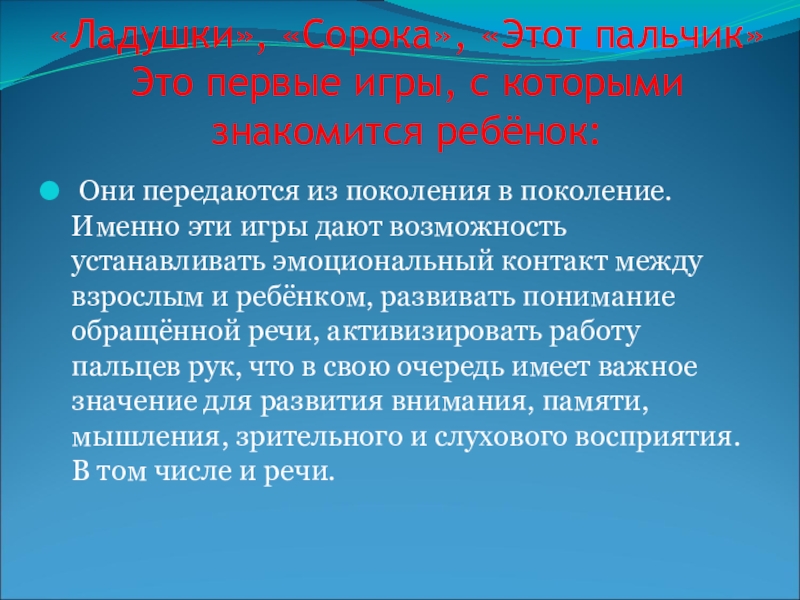Они передаются из поколения в поколение. Именно эти игры дают возможность устанавливать эмоциональный контакт между взрослым и ребёнком, развивать понимание обращённой речи, активизировать работу пальцев рук, что в свою очередь имеет важное значение для развития внимания, памяти, мышления, зрительного и слухового восприятия. В том числе и речи.